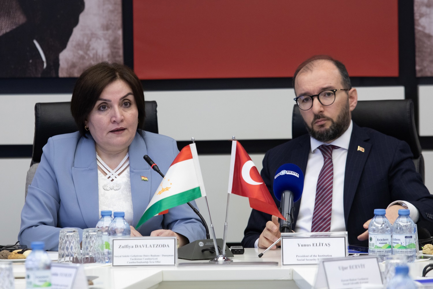 "Tacikistan'ın Sağlıklı Ulusu Projesi” kapsamında gerçekleşen görüşmelerde, sosyal sigorta ve emeklilik sistemlerinin yönetimine yönelik yaklaşımlar, nüfusa yönelik sosyal destek araçlarının iyileştirilmesi, hizmetlerin yönetiminde dijital çözümlerin uygulanması ve sosyal sistemin uzun vadeli sürdürülebilirliğinin sağlanması gibi konular görüşüldü.
